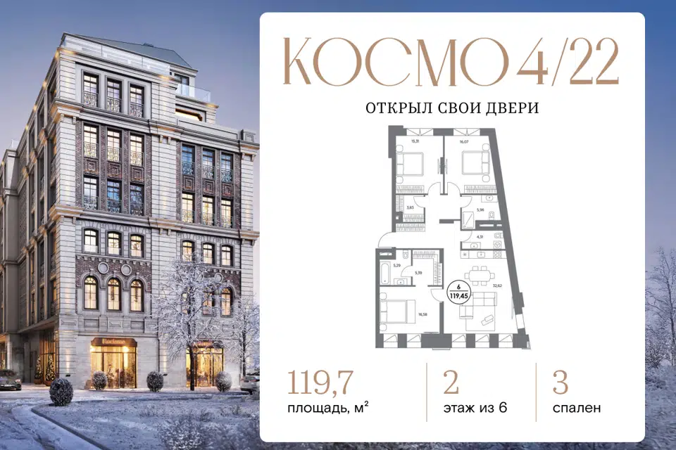 3-комн. кв., 124 м², 2/6 этаж