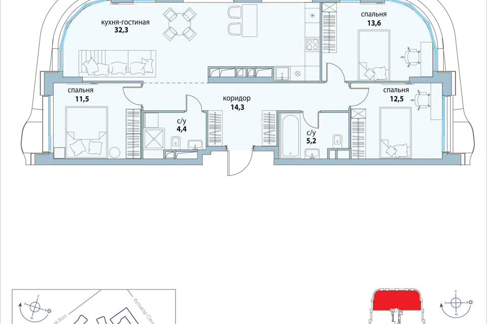 3-комн. кв., 88 м², 6/14 этаж