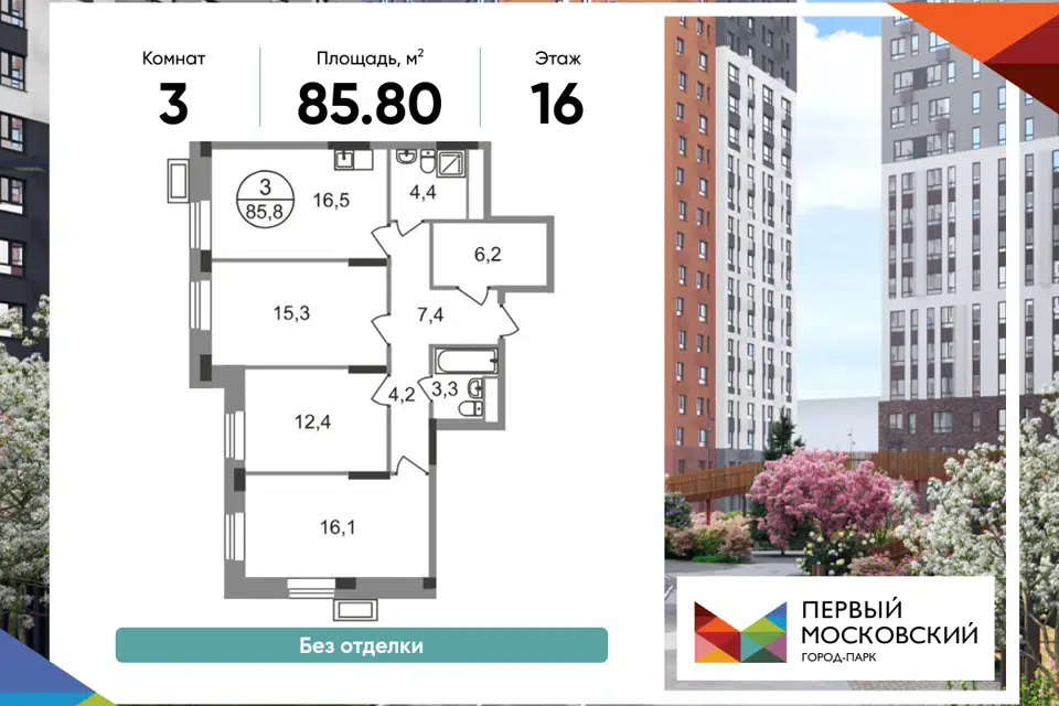 3-комн. кв., 85.8 м², 16/19 этаж