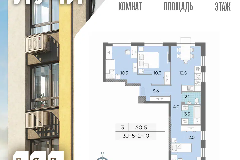 3-комн. кв., 60.6 м², 10/25 этаж