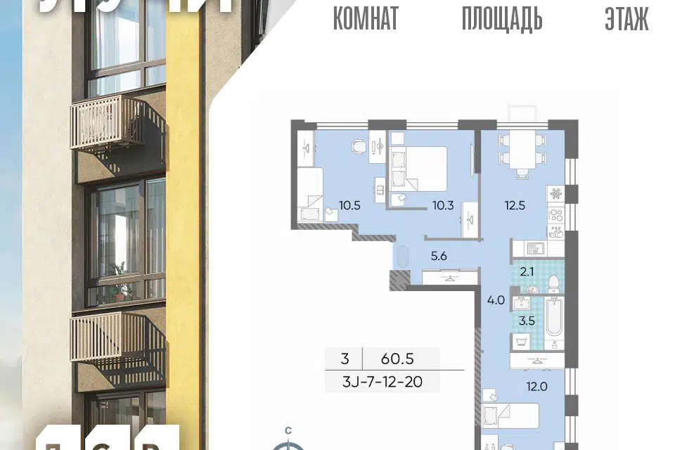 3-комн. кв., 60.5 м², 3/25 этаж