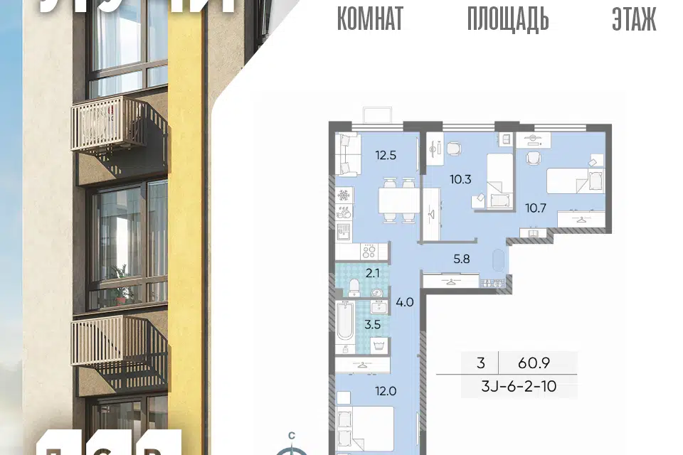 3-комн. кв., 60.7 м², 6/25 этаж