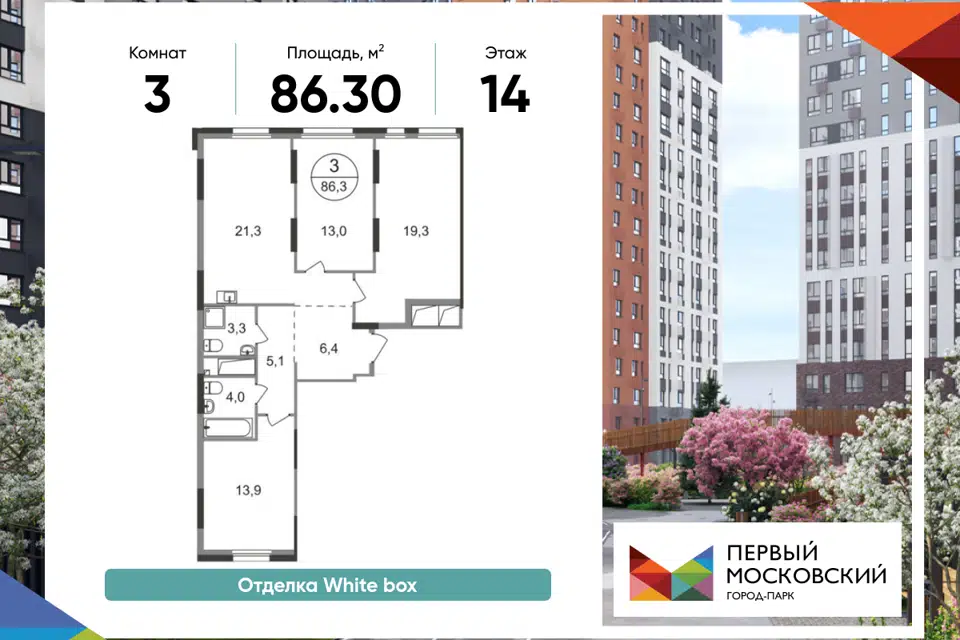 3-комн. кв., 86.3 м², 14/19 этаж