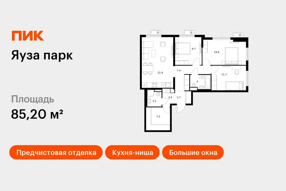 3-комн. кв., 85.8 м², 8/18 этаж