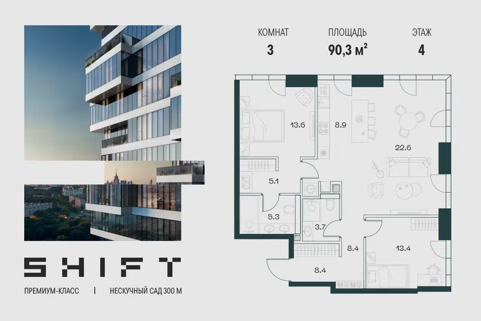 3-комн. кв., 90.3 м², 4/20 этаж