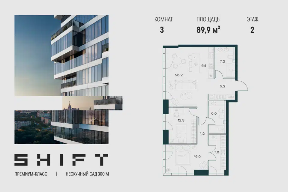 3-комн. кв., 89.9 м², 2/20 этаж