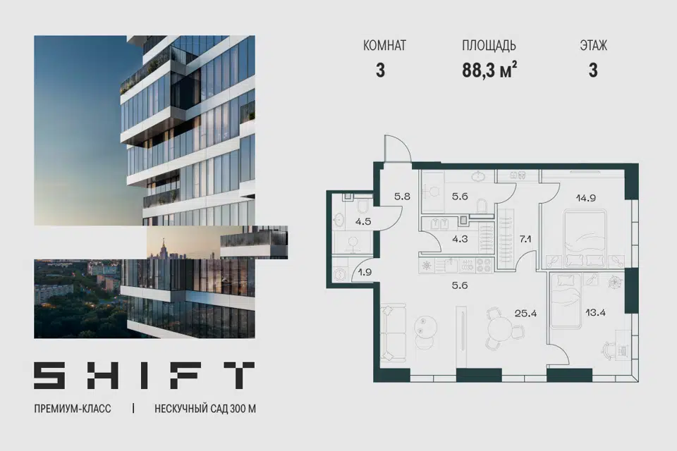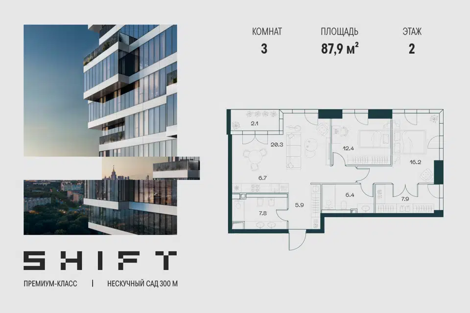 3-комн. кв., 87.9 м², 2/20 этаж
