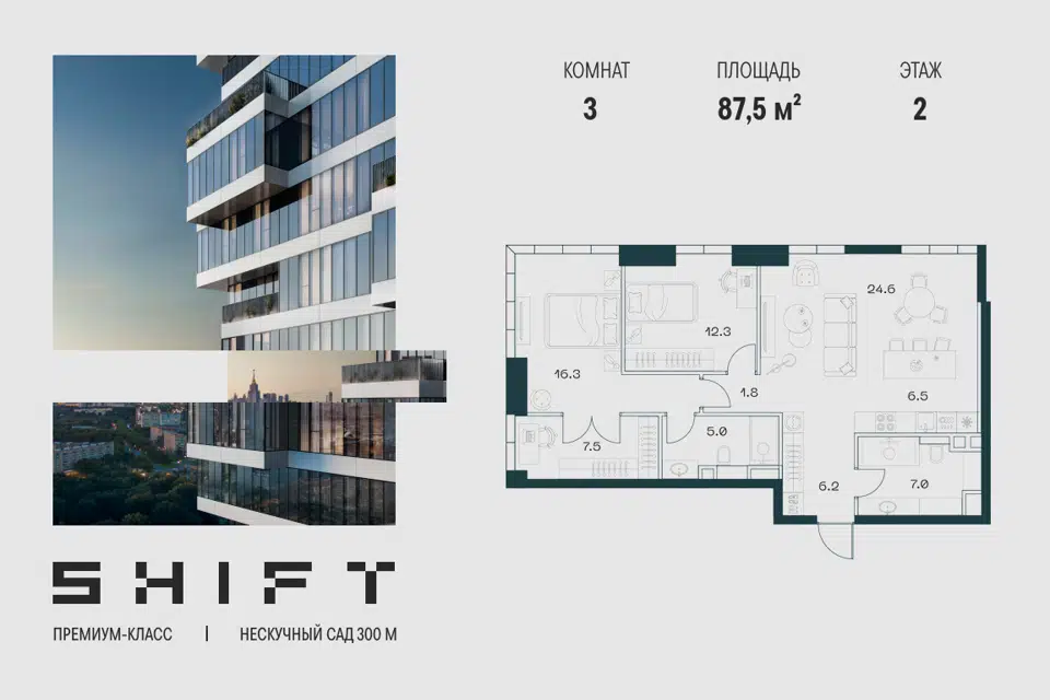 3-комн. кв., 87.5 м², 2/20 этаж