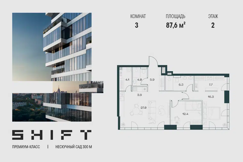 3-комн. кв., 87.6 м², 2/20 этаж