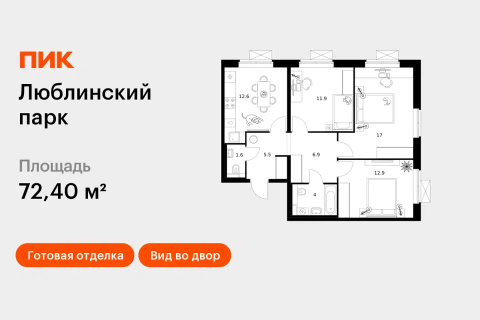 3-комн. кв., 72.5 м², 2/17 этаж