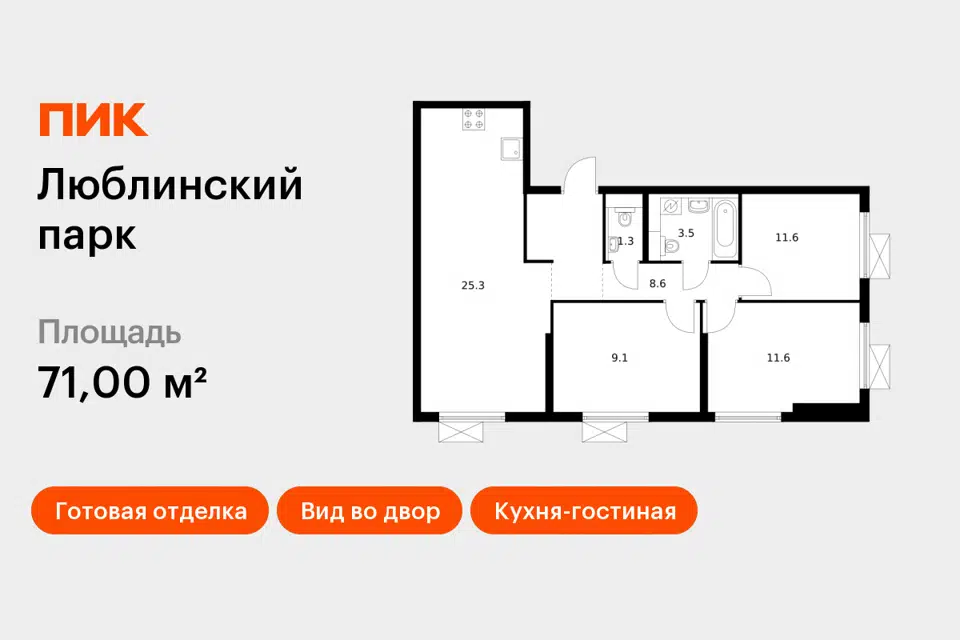 3-комн. кв., 72.4 м², 2/25 этаж