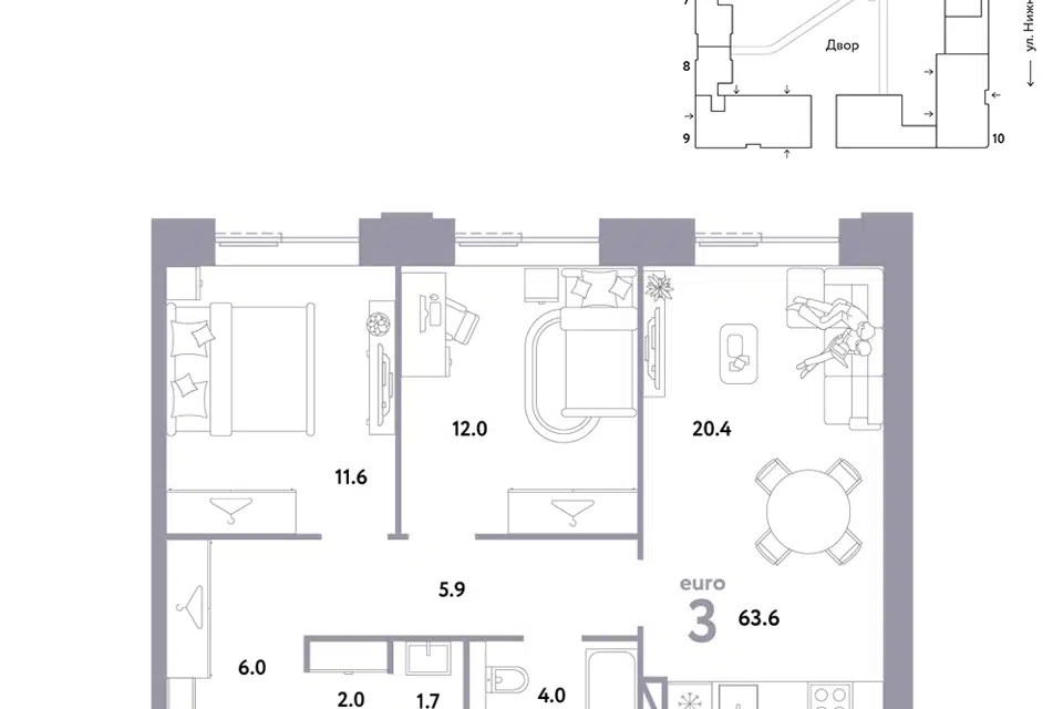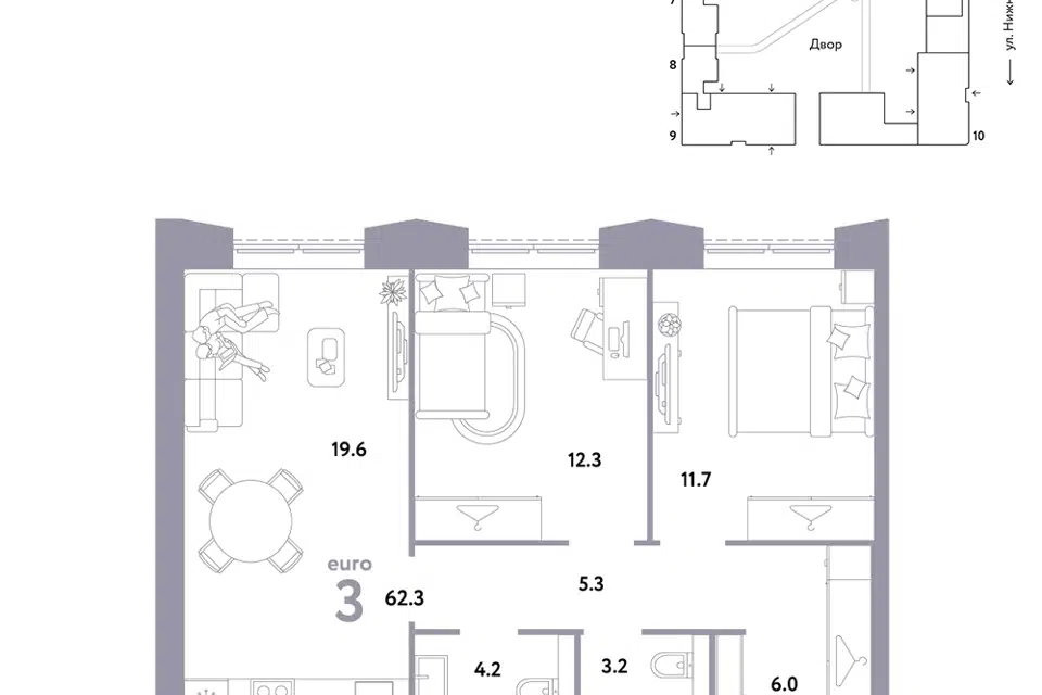3-комн. кв., 59.3 м², 3/9 этаж