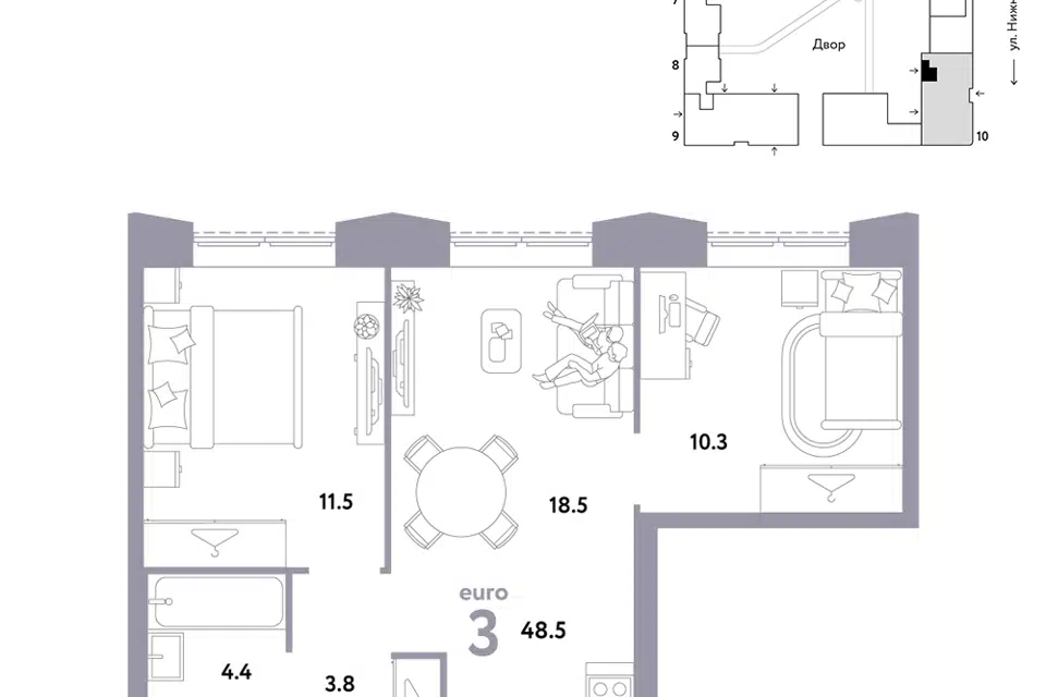 3-комн. кв., 48.5 м², 3/38 этаж