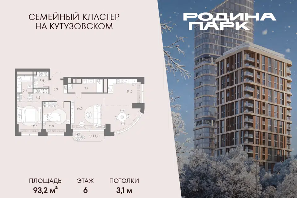 3-комн. кв., 92.1 м², 6/23 этаж