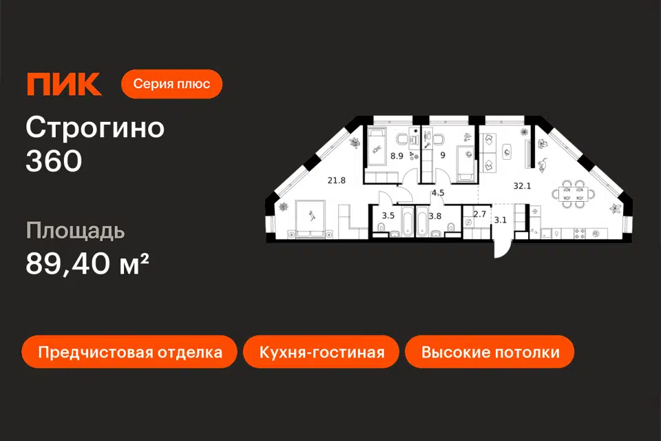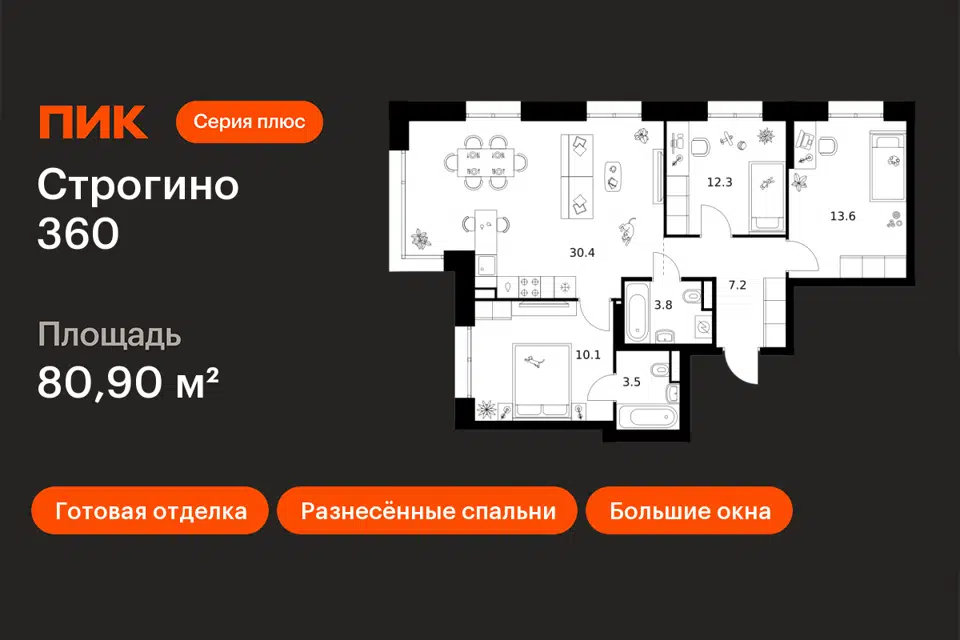 3-комн. кв., 90.4 м², 28/30 этаж