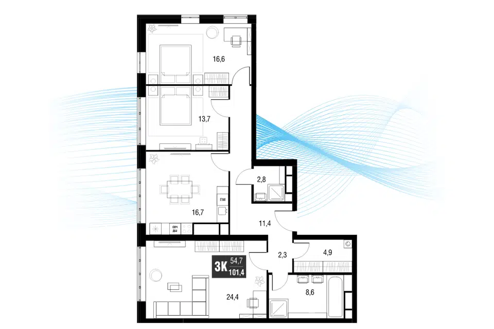 3-комн. кв., 101.9 м², 28/53 этаж