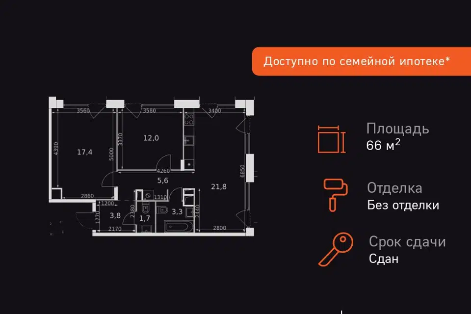3-комн. кв., 66.2 м², 15/17 этаж