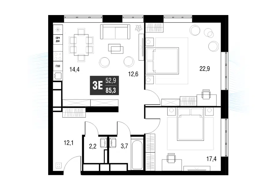 3-комн. кв., 85.2 м², 44/53 этаж