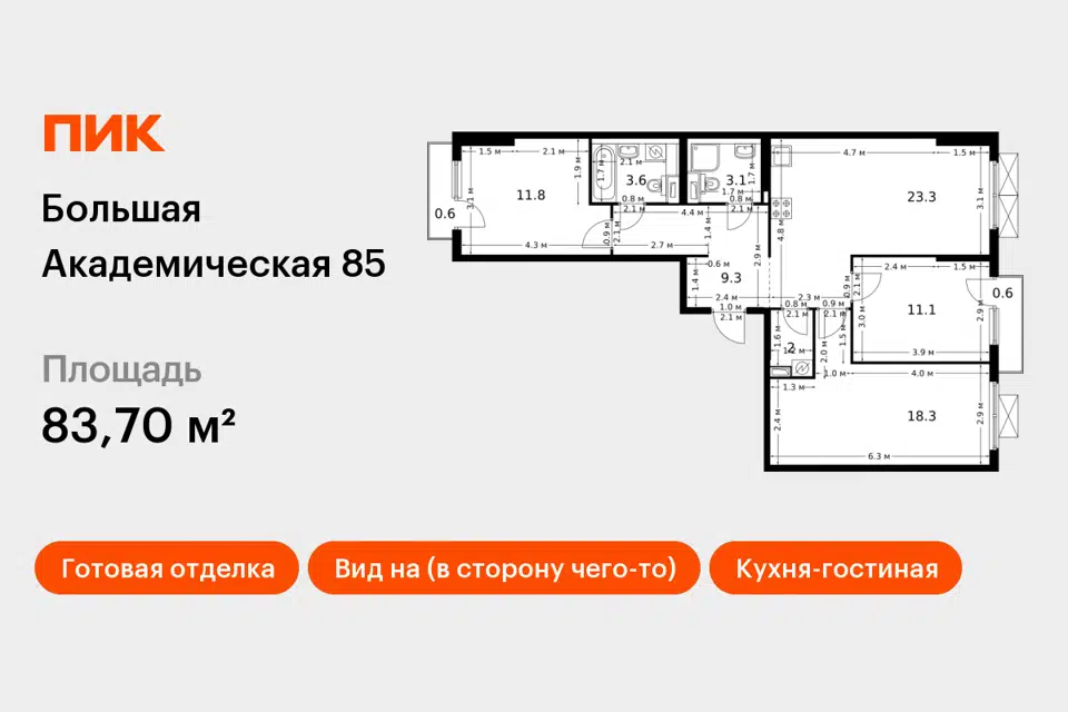 3-комн. кв., 69.3 м², 3/12 этаж