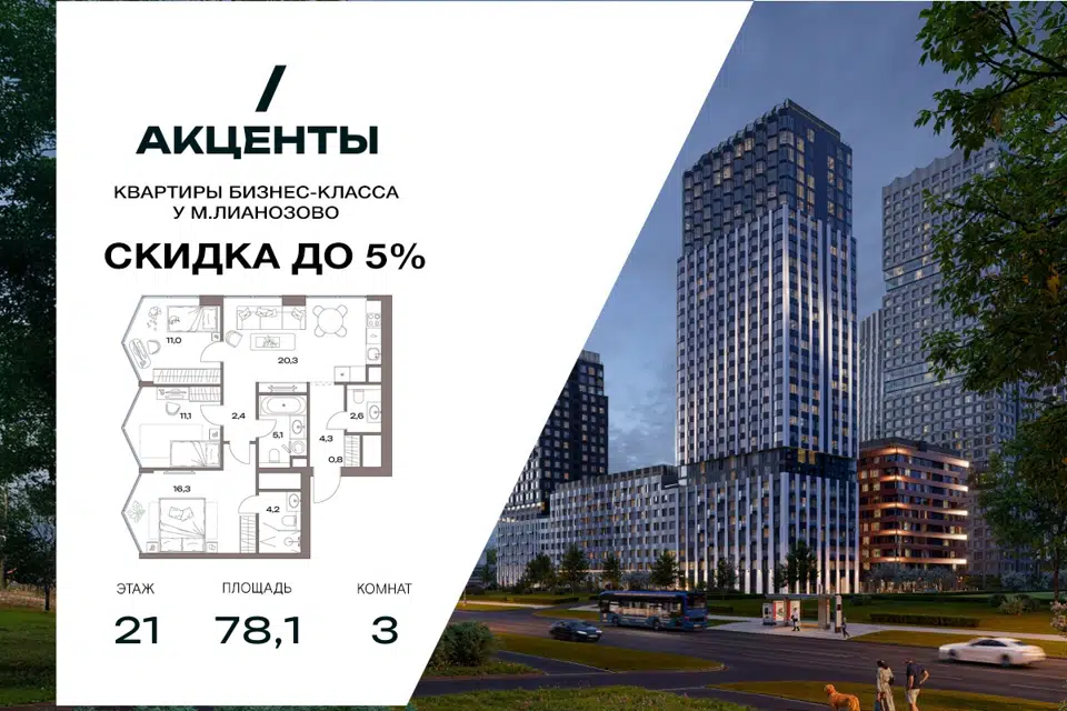 3-комн. кв., 78.1 м², 21/30 этаж