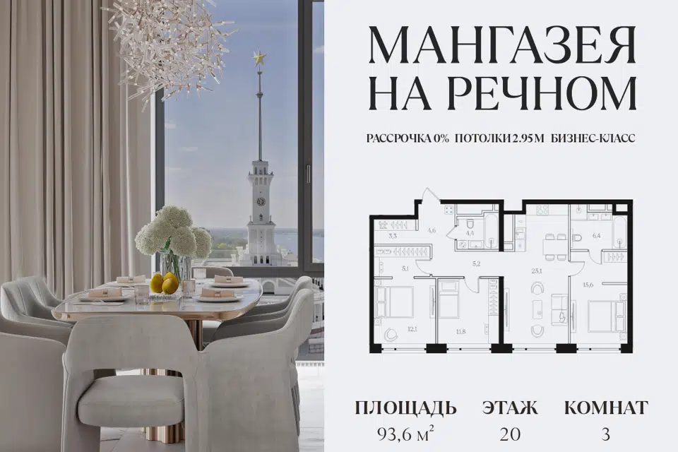 3-комн. кв., 93.6 м², 20/12 этаж