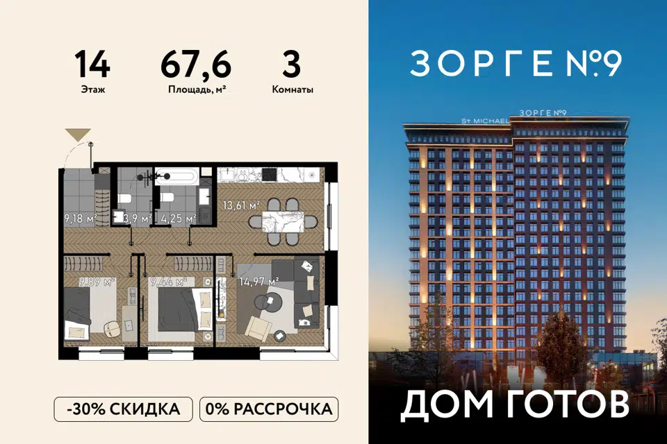 3-комн. кв., 67.6 м², 14/23 этаж