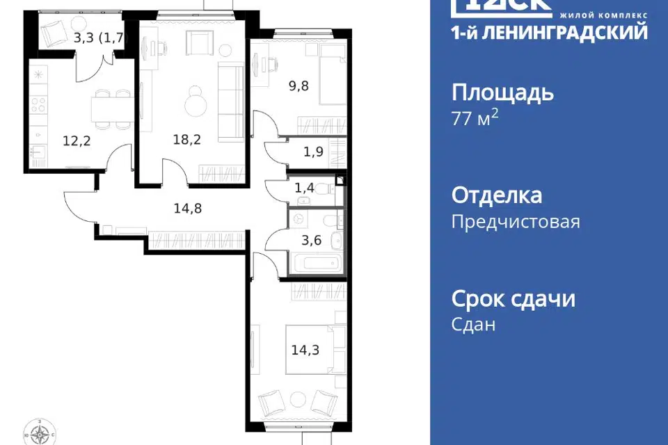 3-комн. кв., 77.8 м², 3/14 этаж