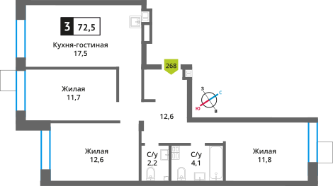 3-комн. кв., от 72.4 м², 5/10 этаж