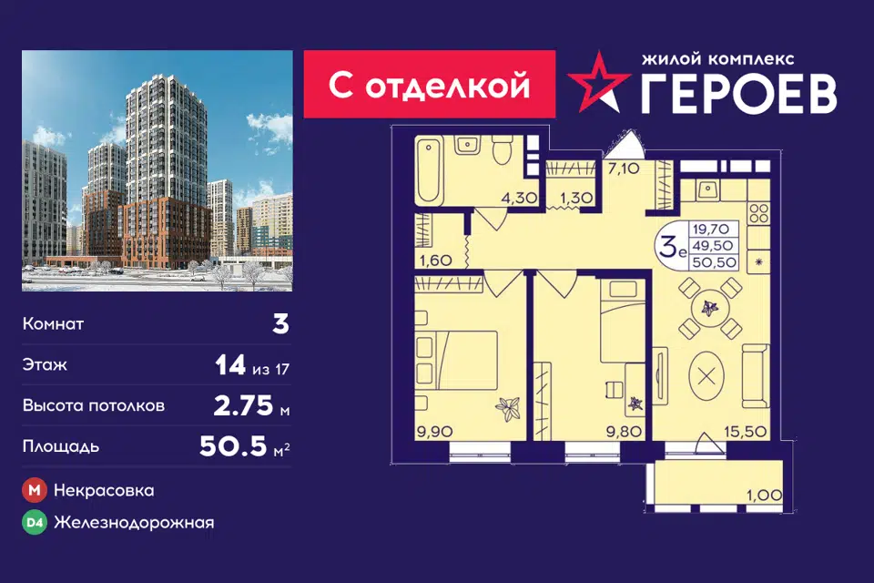 3-комн. кв., от 49.7 м², 4-15 этажи