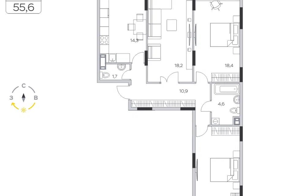 3-комн. кв., 72.9 м², 13/18 этаж
