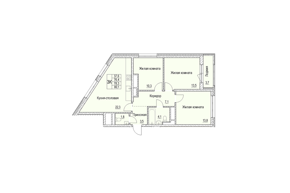3-комн. кв., 79.13 м², 3/7 этаж