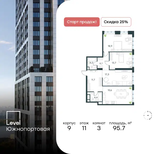 3-комн. кв., от 62.9 м², 6-17 этажи