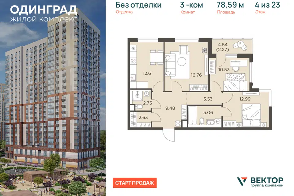 3-комн. кв., от 78.59 м², 3-23 этажи