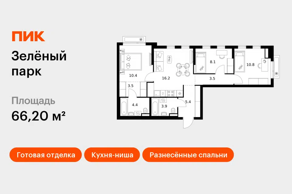3-комн. кв., 66.2 м², 3/28 этаж