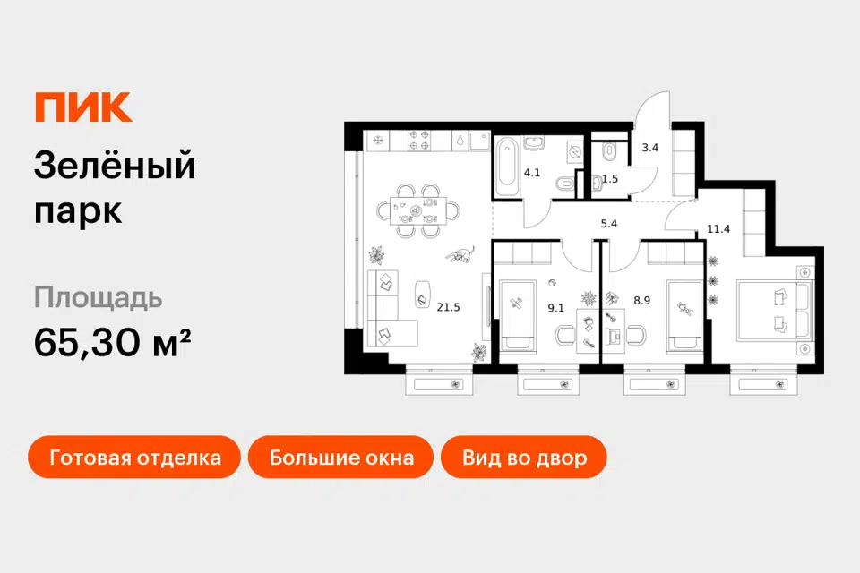 3-комн. кв., 64.9 м², 5/12 этаж