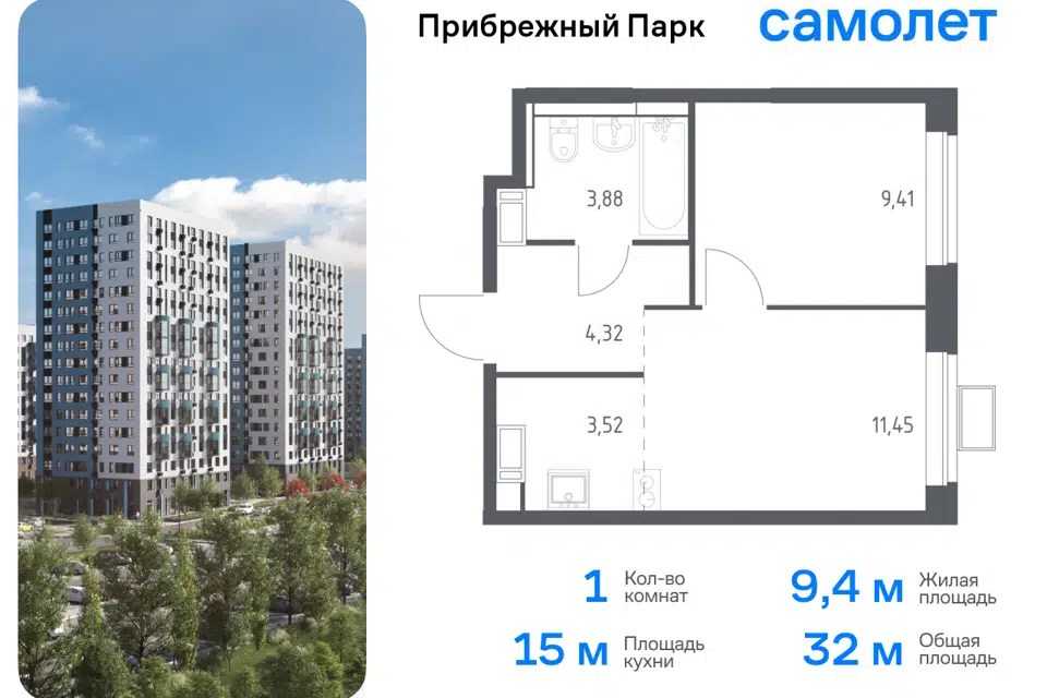 1-комн. кв., от 32.96 м², 9-17 этажи