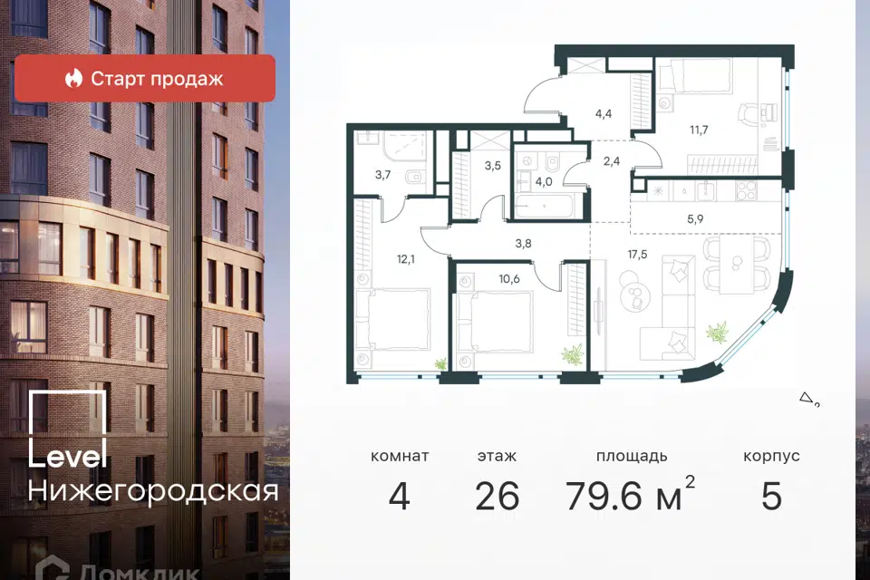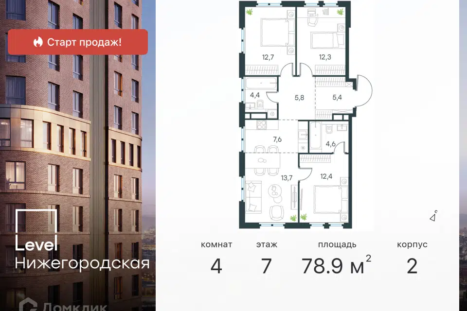 4-комн. кв., 78.9 м², 6/9 этаж