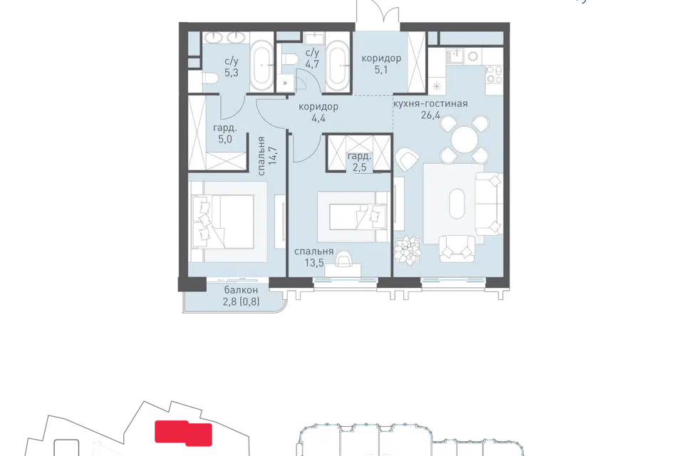 2-комн. кв., от 77.6 м², 2-22 этажи