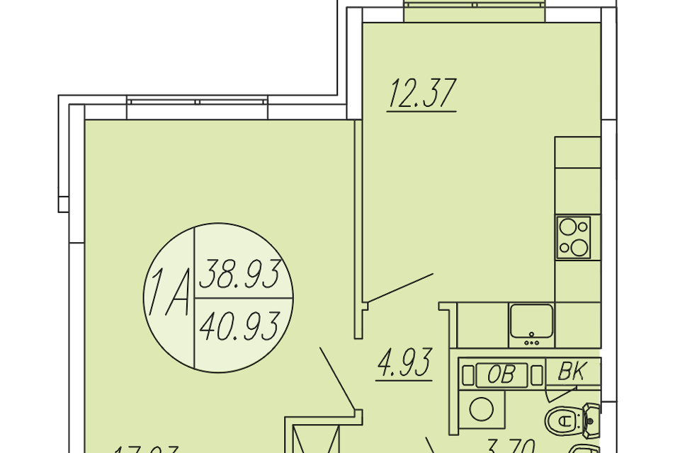 1-комн. кв., 40.93 м², 4/4 этаж