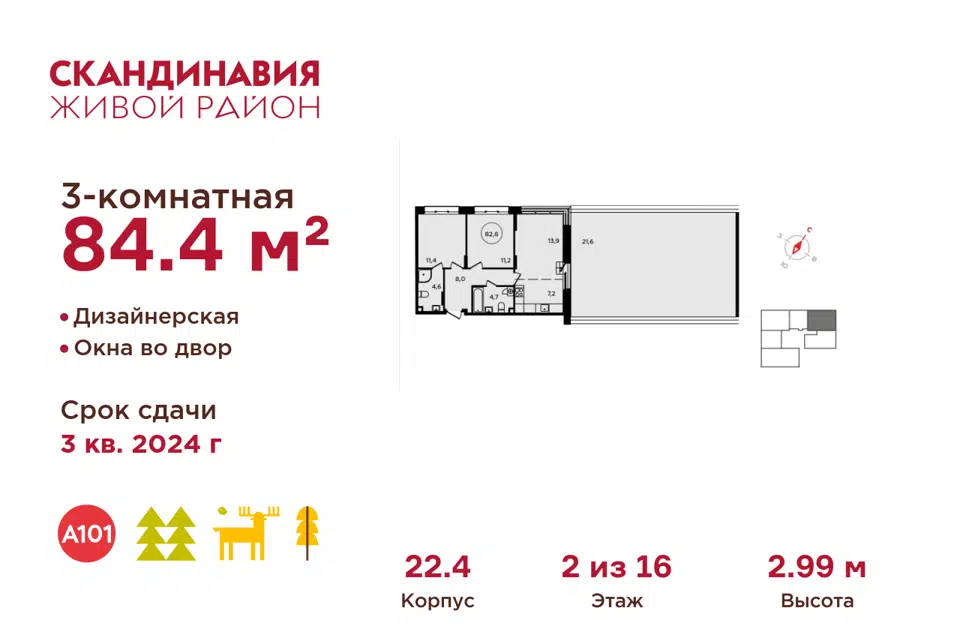 3-комн. кв., 84.4 м², 2/16 этаж