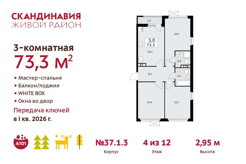 3-комн. кв., 73.3 м², 10/15 этаж