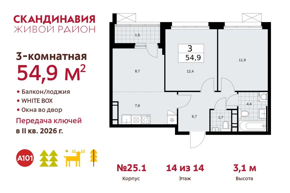 3-комн. кв., от 54.9 м², 13/14 этаж