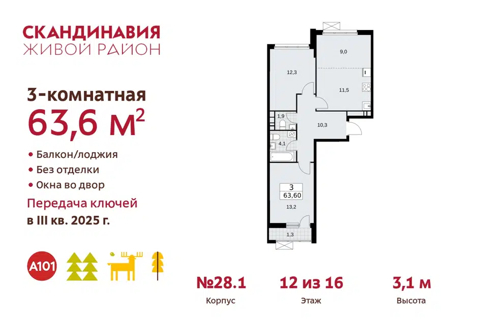 3-комн. кв., от 63.6 м², 2-10 этажи