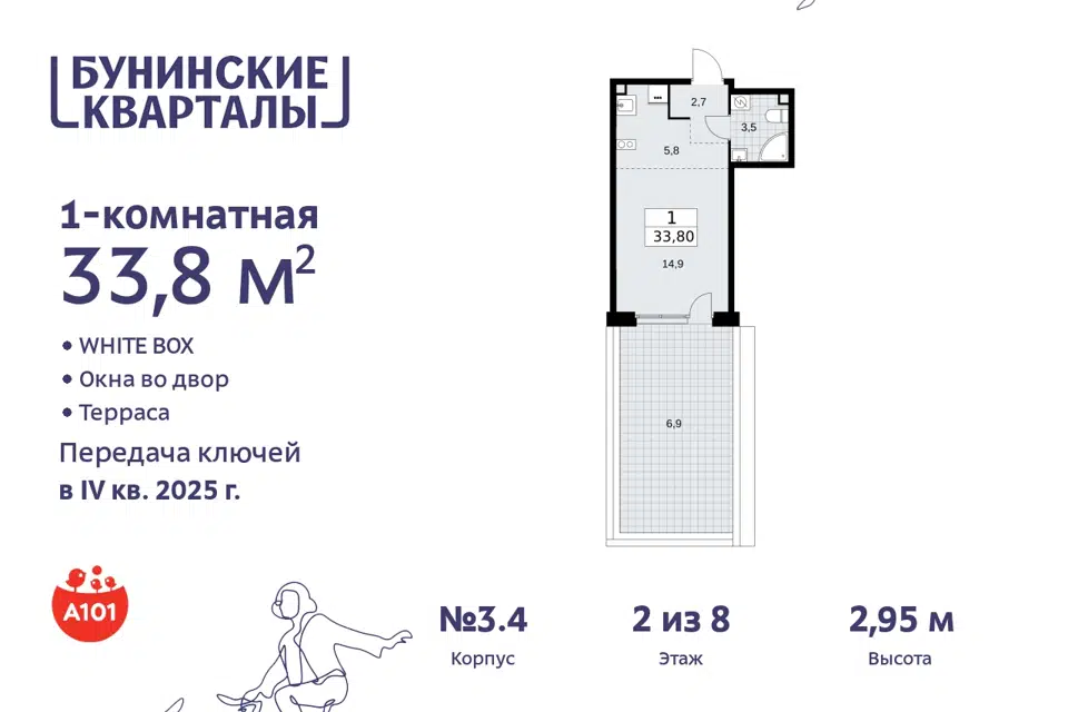 1-комн. кв., 33.8 м², 6/19 этаж