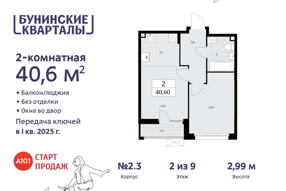2-комн. кв., 40.6 м², 16/19 этаж