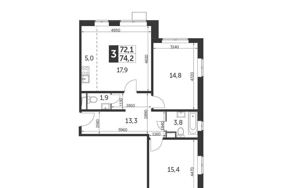 3-комн. кв., от 74.9 м², 2-17 этажи