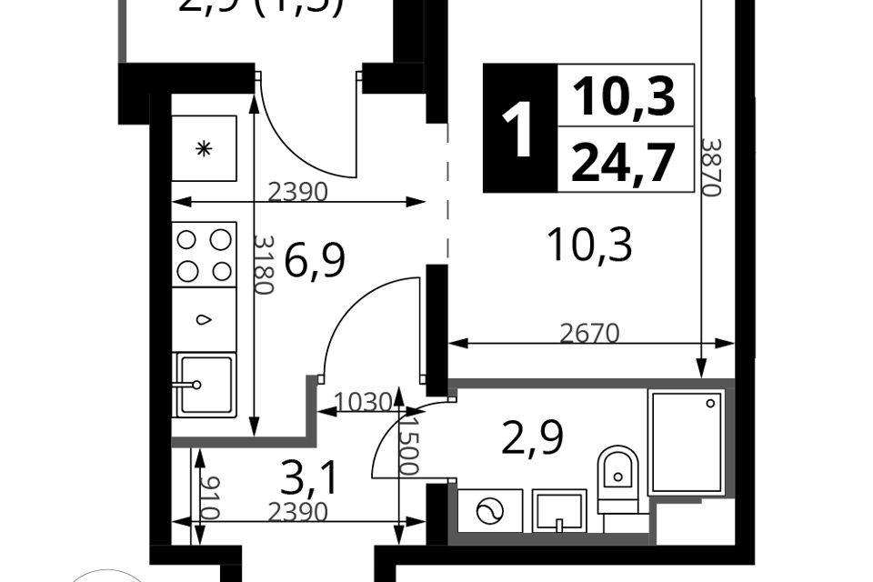 1-комн. кв., от 24.6 м², 1-24 этажи