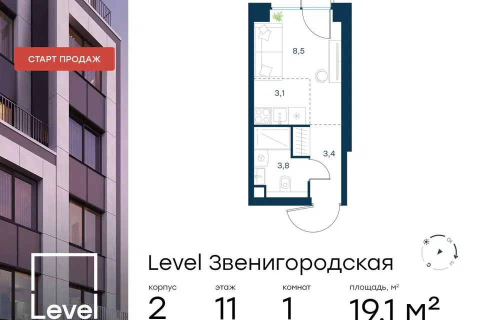 Студия, 19.1 м², 4/64 этаж