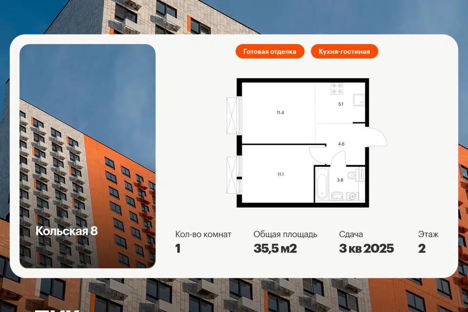 1-комн. кв., от 35.5 м², 2-22 этажи