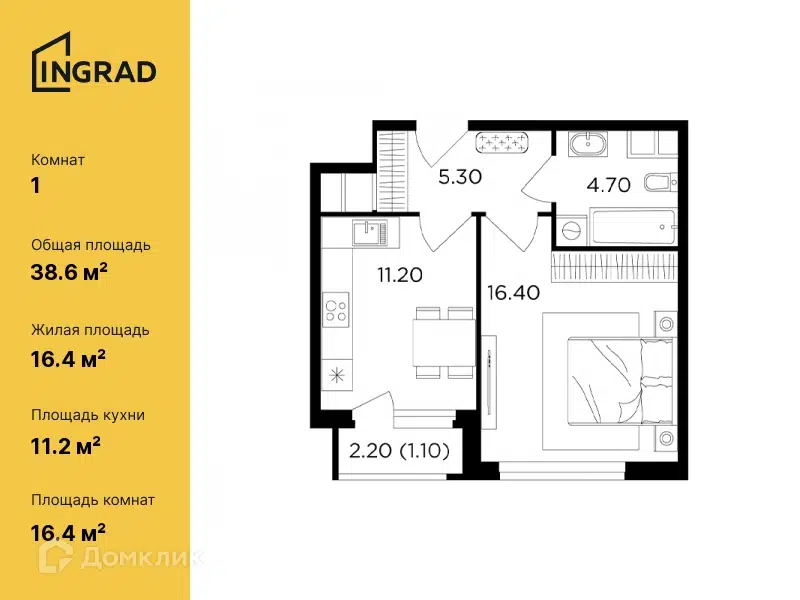 1-комн. кв., от 38.6 м², 1-20 этажи